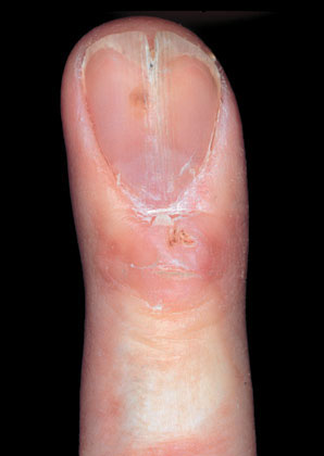 Eksempel på kronisk misdannet negl efter sår i neglelejet for 20 år siden. Foto venligst udlånt af Danderm