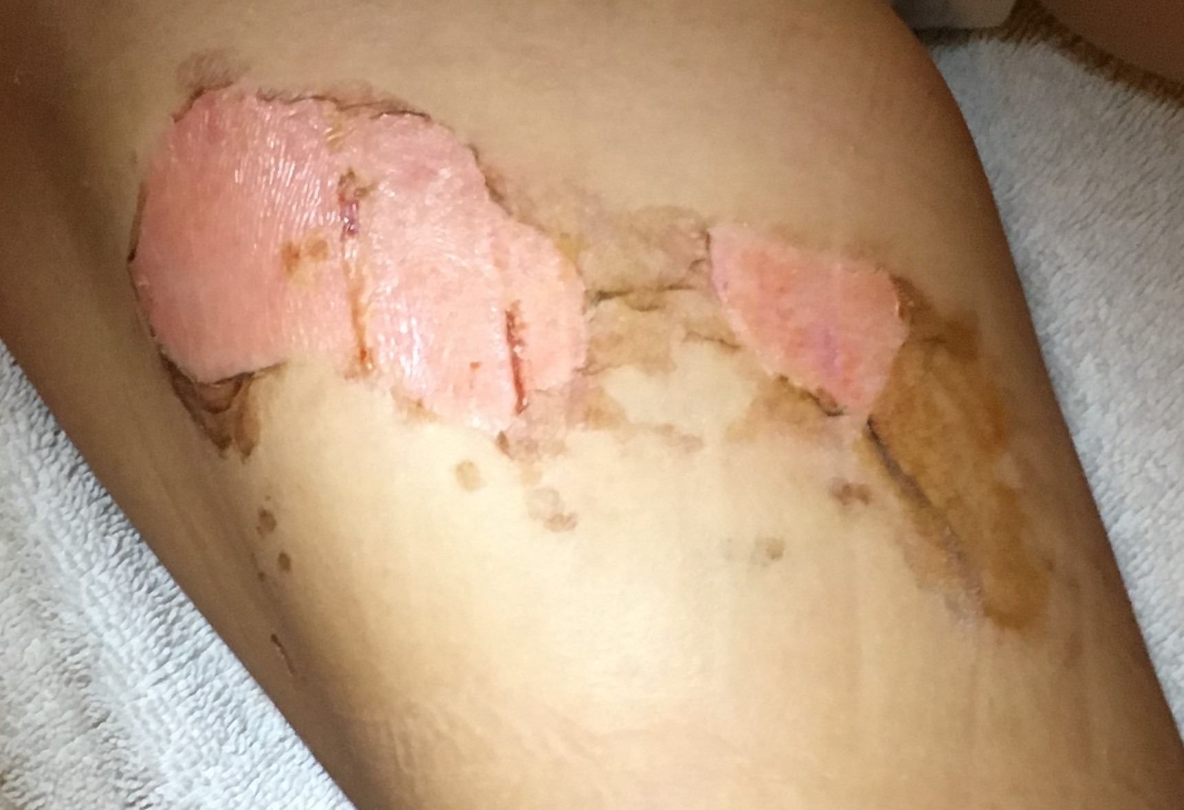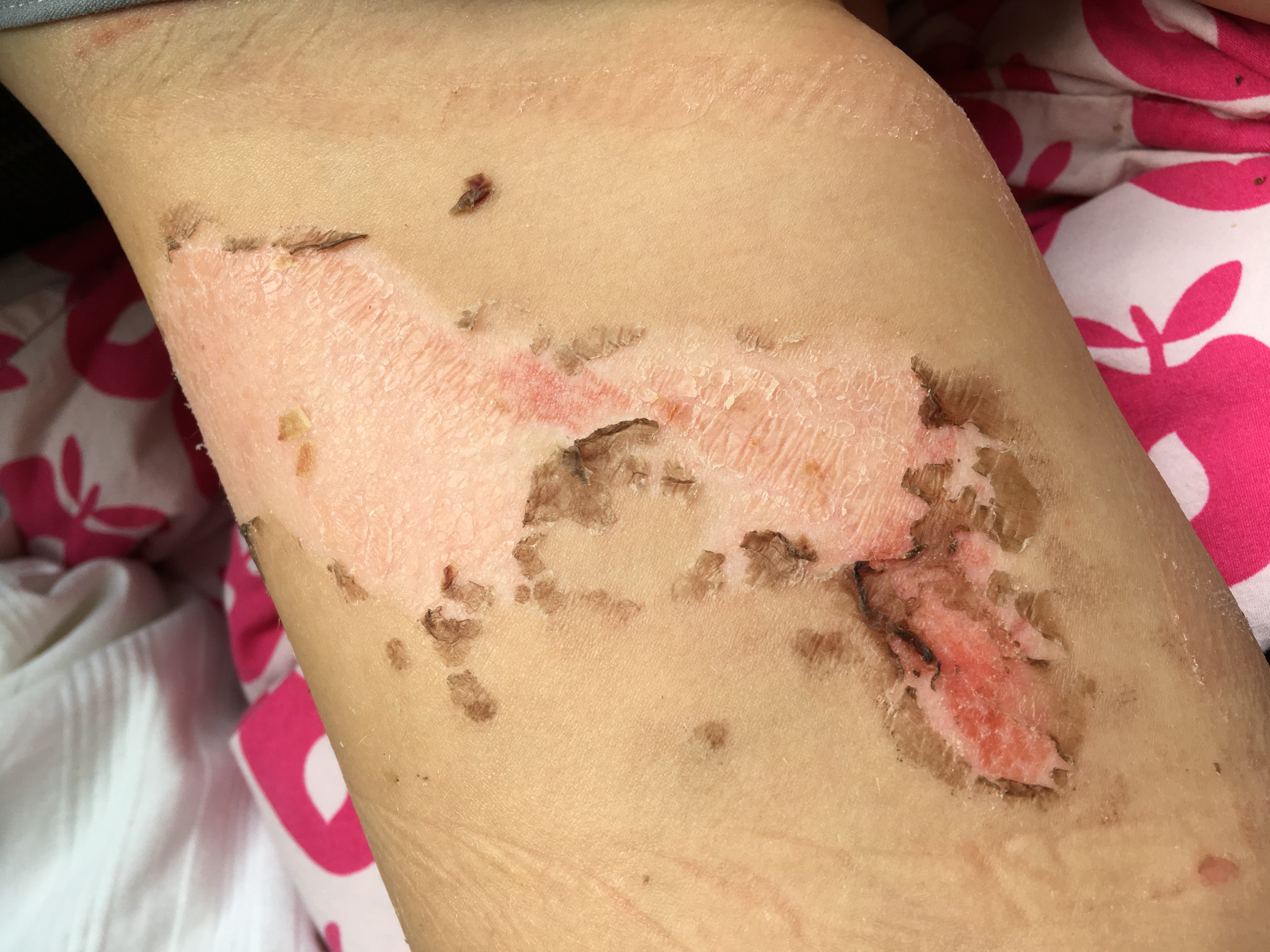 - Blærerne er nu væk og der er dannet fin ny lyserød hud i de 2. grads forbrændte områder, hvor blærerne var.