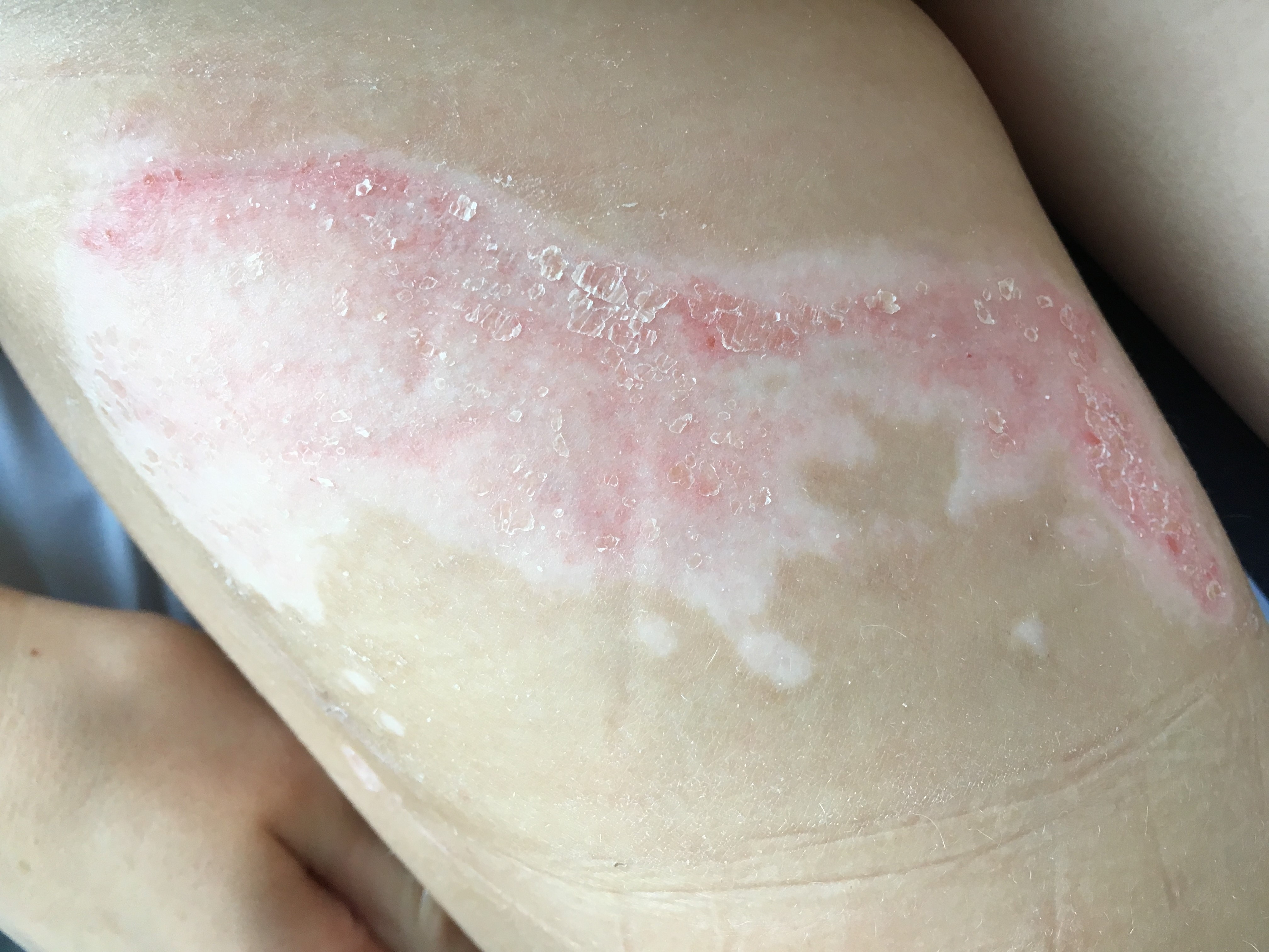 - Den lyserøde nydannede hud tager efterhånden farve som den omliggende hud, hyperæmien aftager.