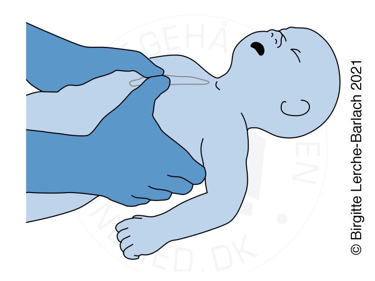 - Grib om barnets brystkasse med dine tommelfingre placeret ved nederste del af brystbenet og dine fingre langs rygsøjlen.
