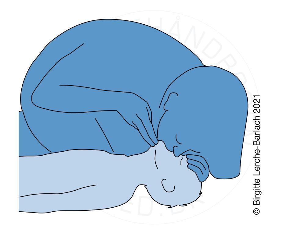 - Placer din ene håndrod over barnets brystben og læg den anden hånd ovenpå - flet fingrene.
