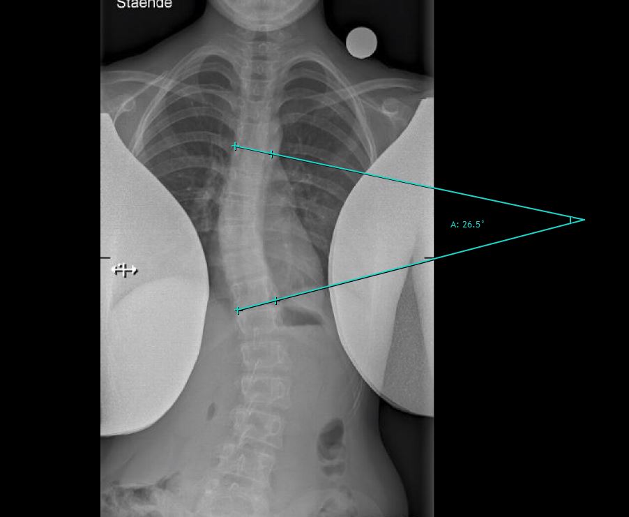 Ved skæv ryg (skoliose) beregnes ryggens skævhed ved at måle skoliosevinklen også kaldet Cobb's vinkel, som er vinklen mellem linjerne på røntgenbilledet.