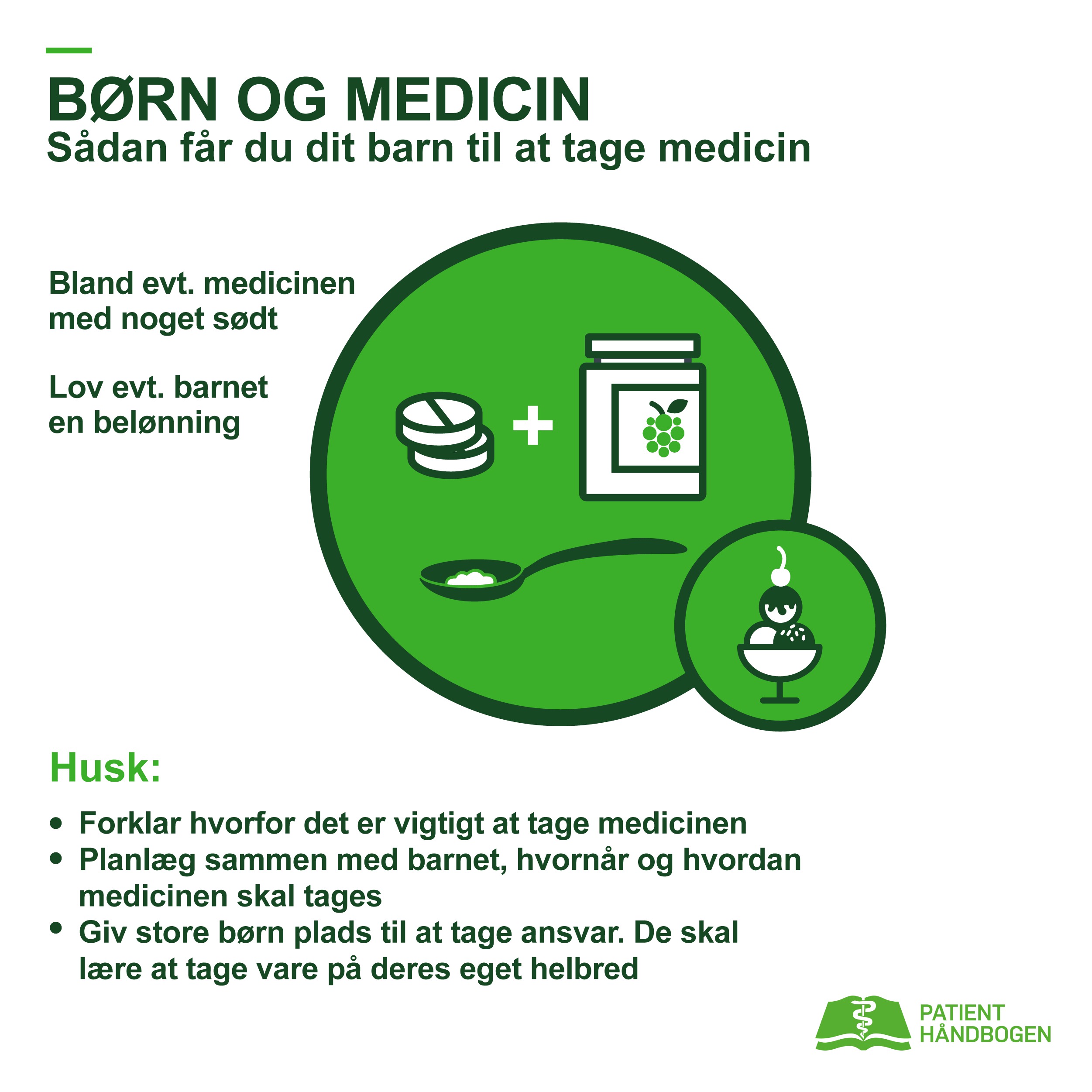 Små børn bør hellere få flydende medicin end tabletter. Mange anbefaler at bestikke eller belønne barnet - fx med løfte om en is, efter at barnet har taget medicinen.