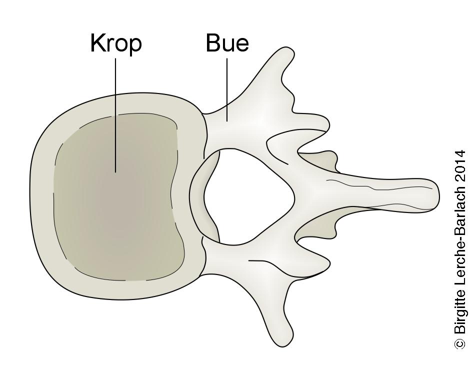 Som figuren viser, består en ryghvirvel af en krop (hvirvellegeme) og en bue. Hvirvlerne hænger sammen gennem kontakt mellem fladerne på kroppen og gennem led, der sidder på buen (bueled). Ydermere er de pakket ind i bindevæv og muskulatur.