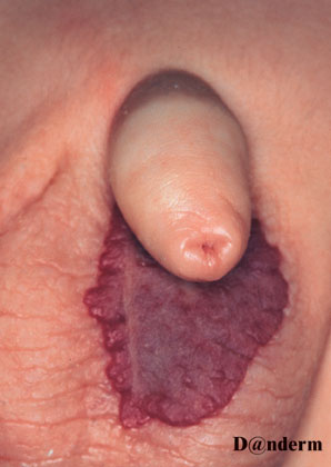 Jordbærmærke på pungen, som typisk ikke kræver behandling medmindre det vokser sig meget større. Foto venligst udlånt af Danderm