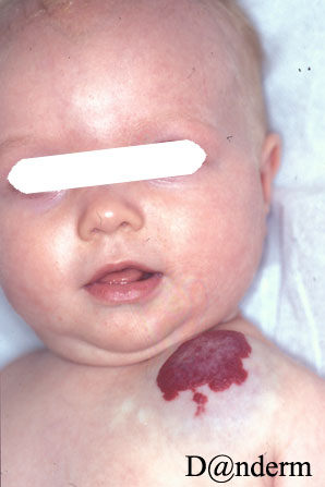 Foto af mere rødligt og mere uregelmæssigt formet hæmangiom. Venligst udlånt af Danderm