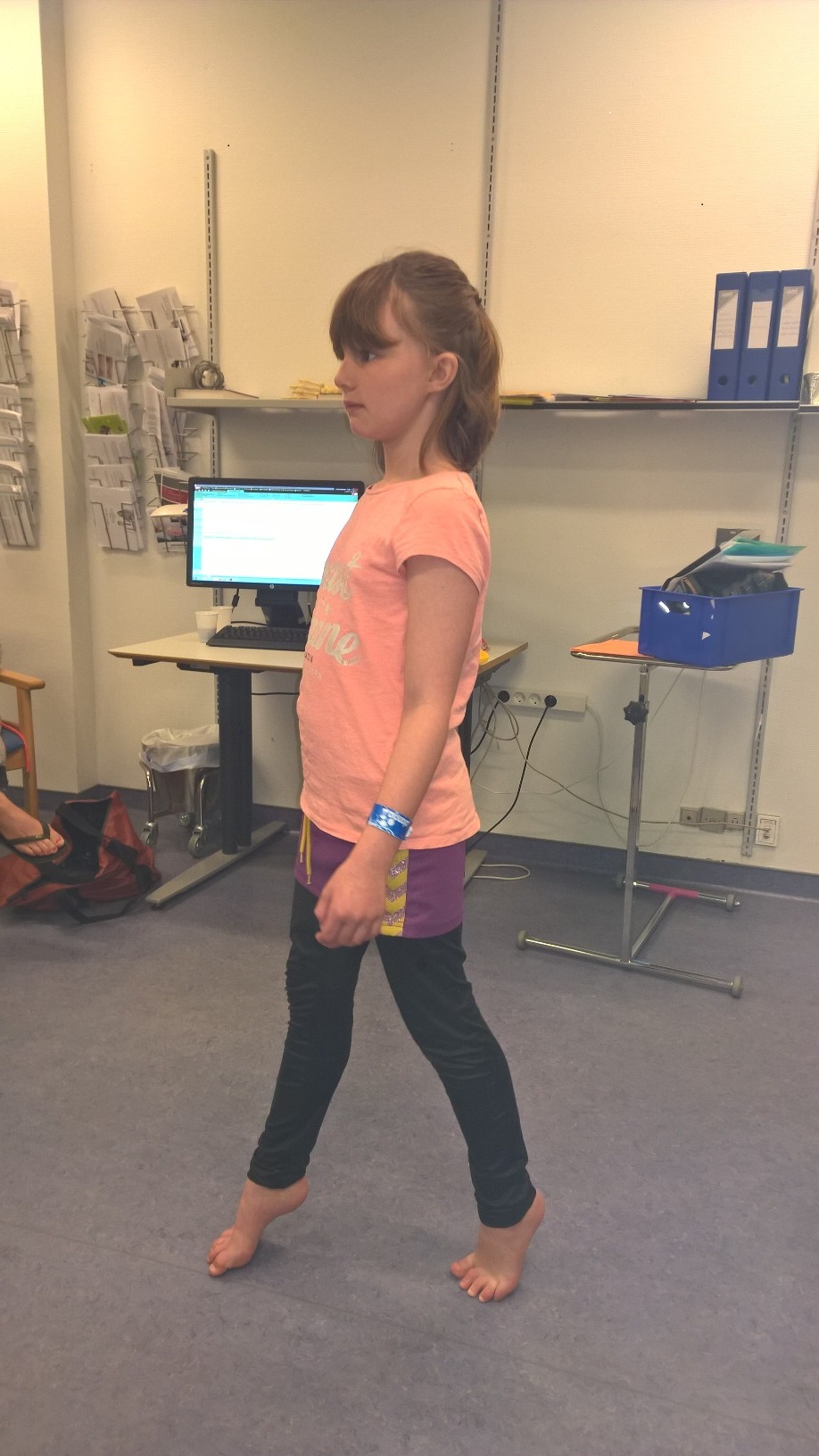 Barnet sætter forfoden i gulvet under gang i stedet for hæl til tågang. Barnet kan ofte gå på flad fod, når man beder om det, men begynder at gå på tæer, når det afledes igen.
