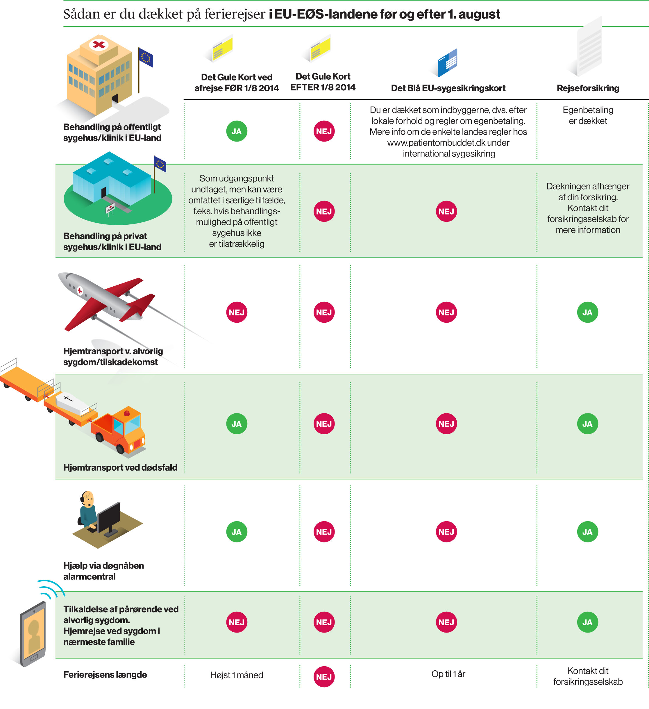 Det blå EU-sygesikringskort dækker både akut sygdom/tilskadekomst og såkaldt 'behovsbestemt sygehjælp'. Det er lægen, der afgør, hvilken behandling der er nødvendig under opholdet. Det afhænger bl.a. af, hvor længe man skal opholde sig i landet, og hvilken behandling der er tale om