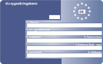 Det blå EU-sygesikringskort giver ret til sygehjælp på samme vilkår som borgerne i det EU-land, man besøger. Nedenfor ser du det blå sygesikringskort. Hvis du ikke har et, så kan du bestille det hos www.borger.dk