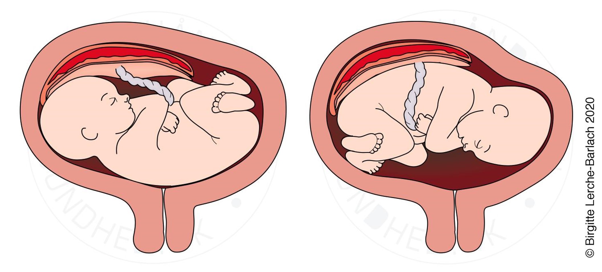 Tegning af foster i tværleje med hhv. ryggen opad og nedad