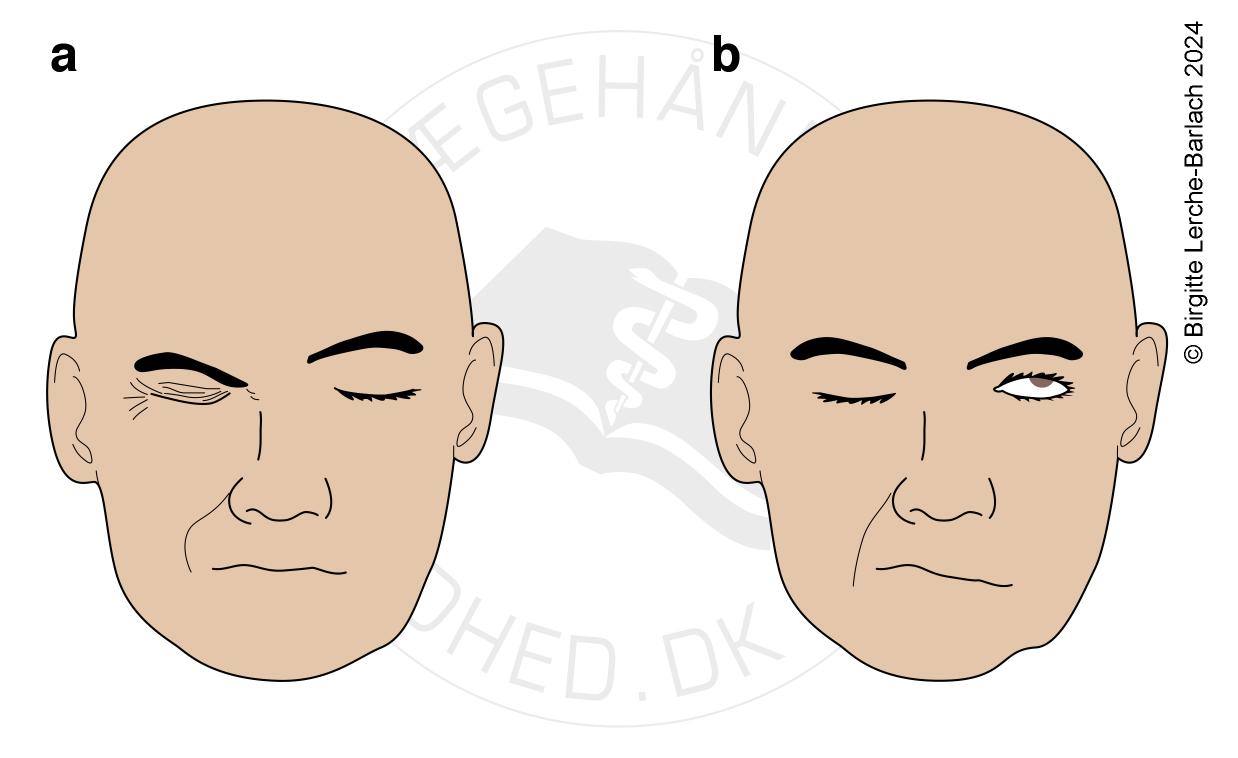 a) Facialisparese i let grad: Øjet på den påvirkede side kan i varierende grad ikke lukkes helt (paralyse af orbicularis oculi). Ved lette defekter i øjenlukningen er øjenvipperne synlige.