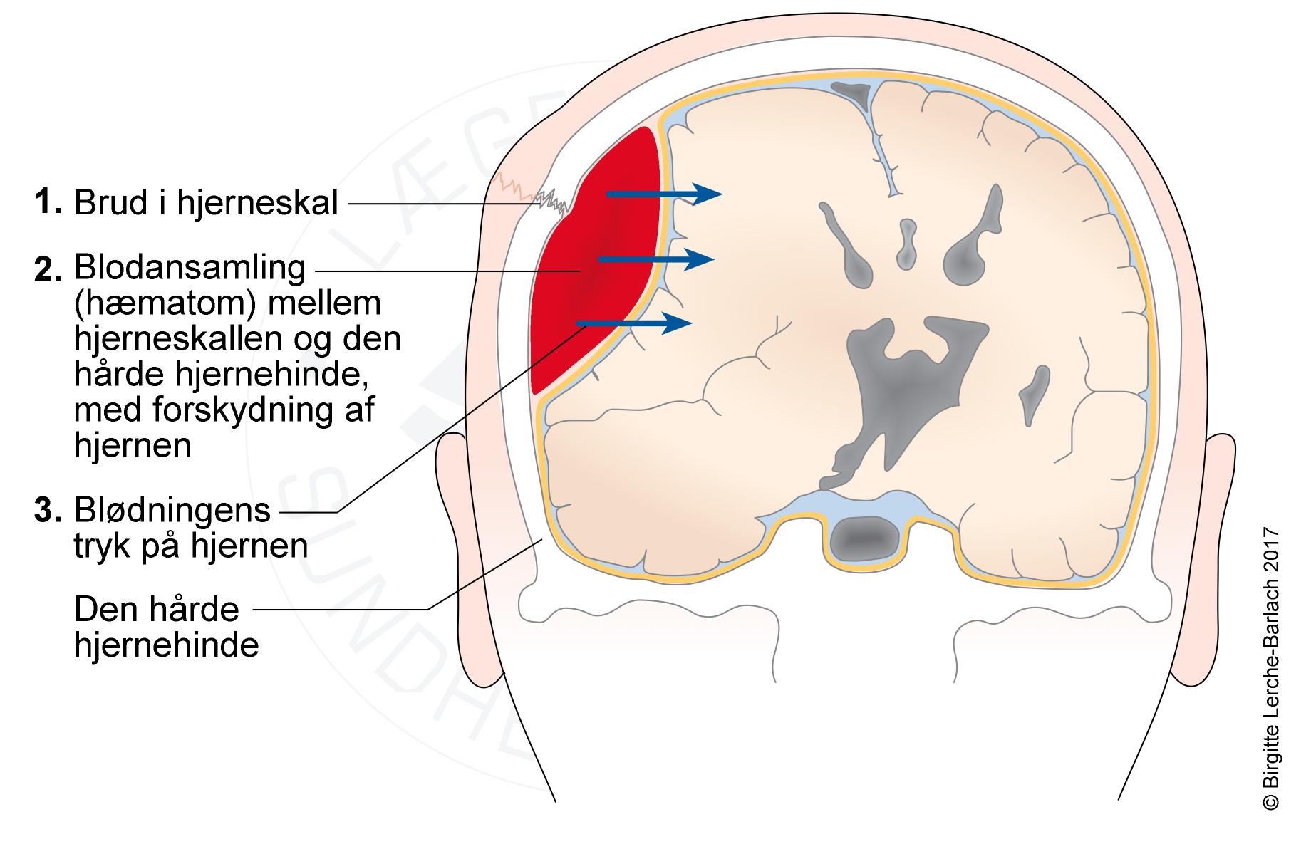 Blødningen er ikke inde i hjernen, men mellem kranieknoglen og den hårde hjernehinde. Her kan blødningen vokse sig større, og trykket i kraniet kan stige
