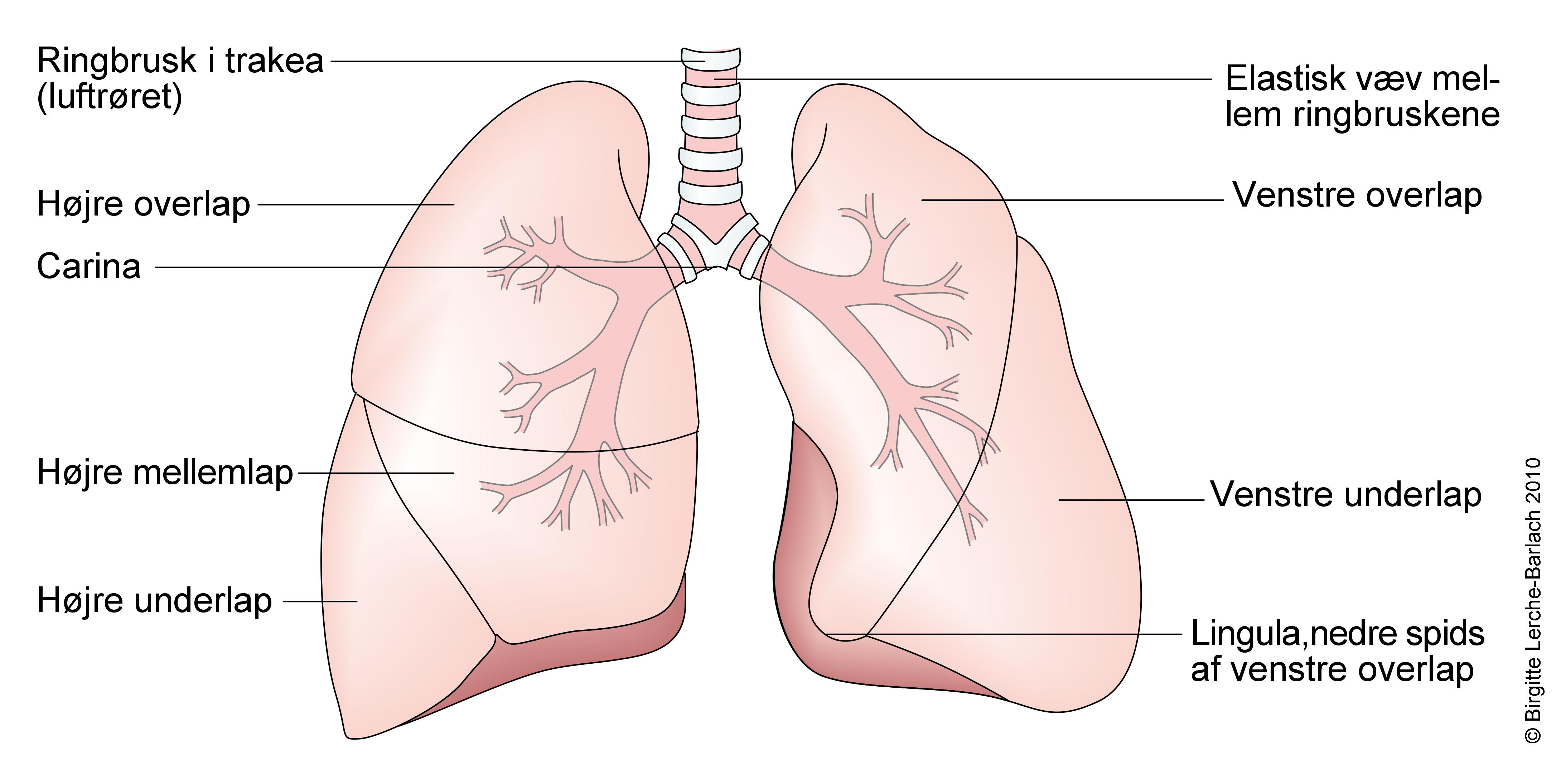 Luftrøret deler sig i to mindre rør (hovedbronkier), som går til hver af de to lunger. I lungerne deler bronkierne sig til mindre rør (bronkioler), som ender i mikroskopiske luftsække (alveoler). Se film, der viser, hvordan lungerne fungerer.