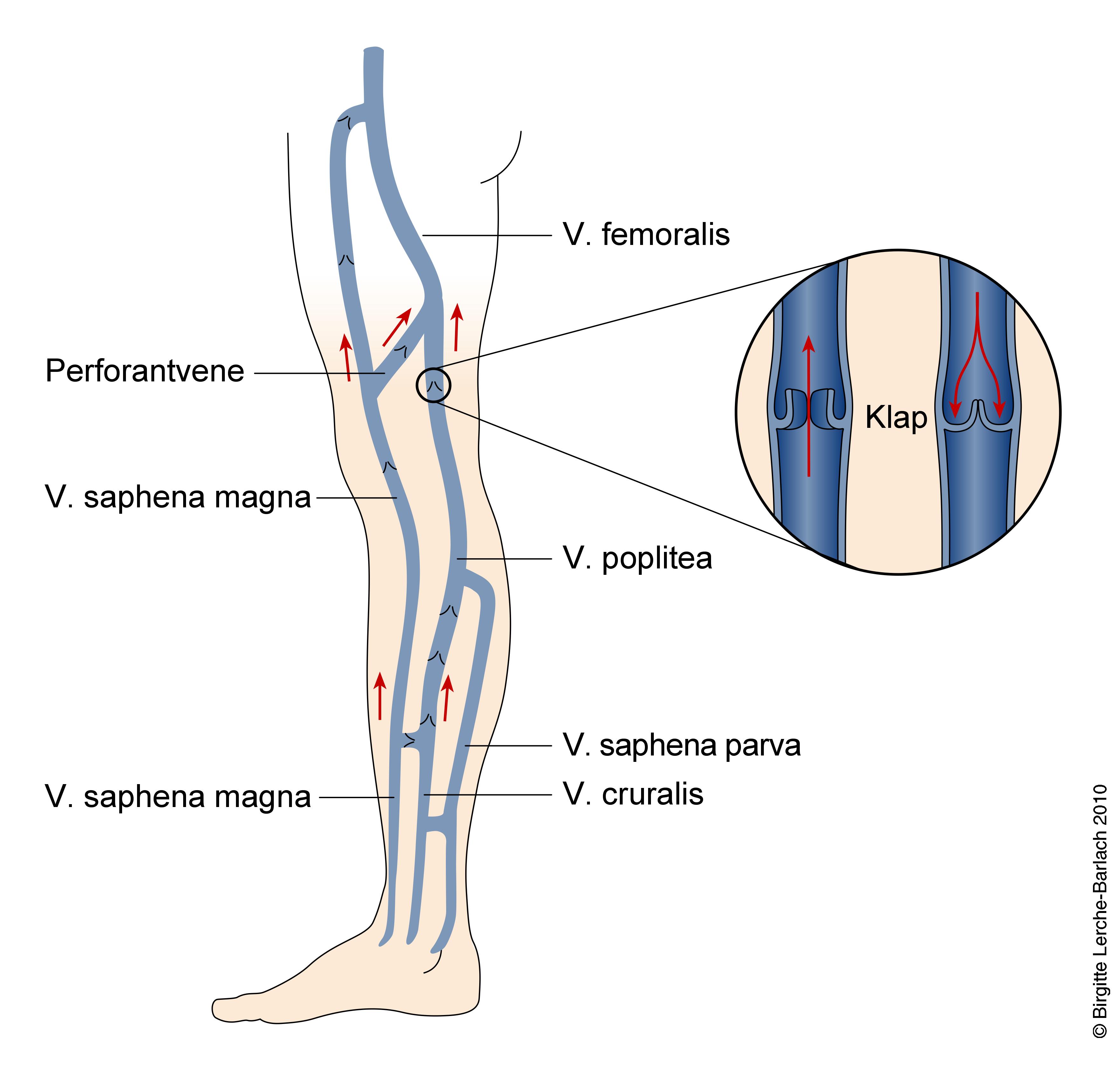 Men hvis klapperne går i stykker, har blodet sværere ved at løbe ud af benet, og det vil hobe sig op i venen. Der kommer forhøjet tryk i venerne i benet, og det kan få væske til at sive ud af blodkarret, ud i vævet - der opstår hævelse, også kaldet ødem.
