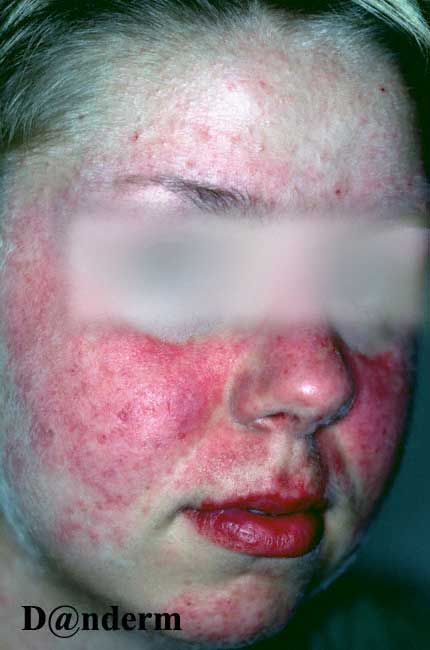 Patienten her har et sommerfugleudslæt, der ses ved systemisk lupus erythematosus, SLE. Men i panden ses også almindelig acne. Flere hudsygdomme kan ligne et sommerfugleudslæt uden at være det.