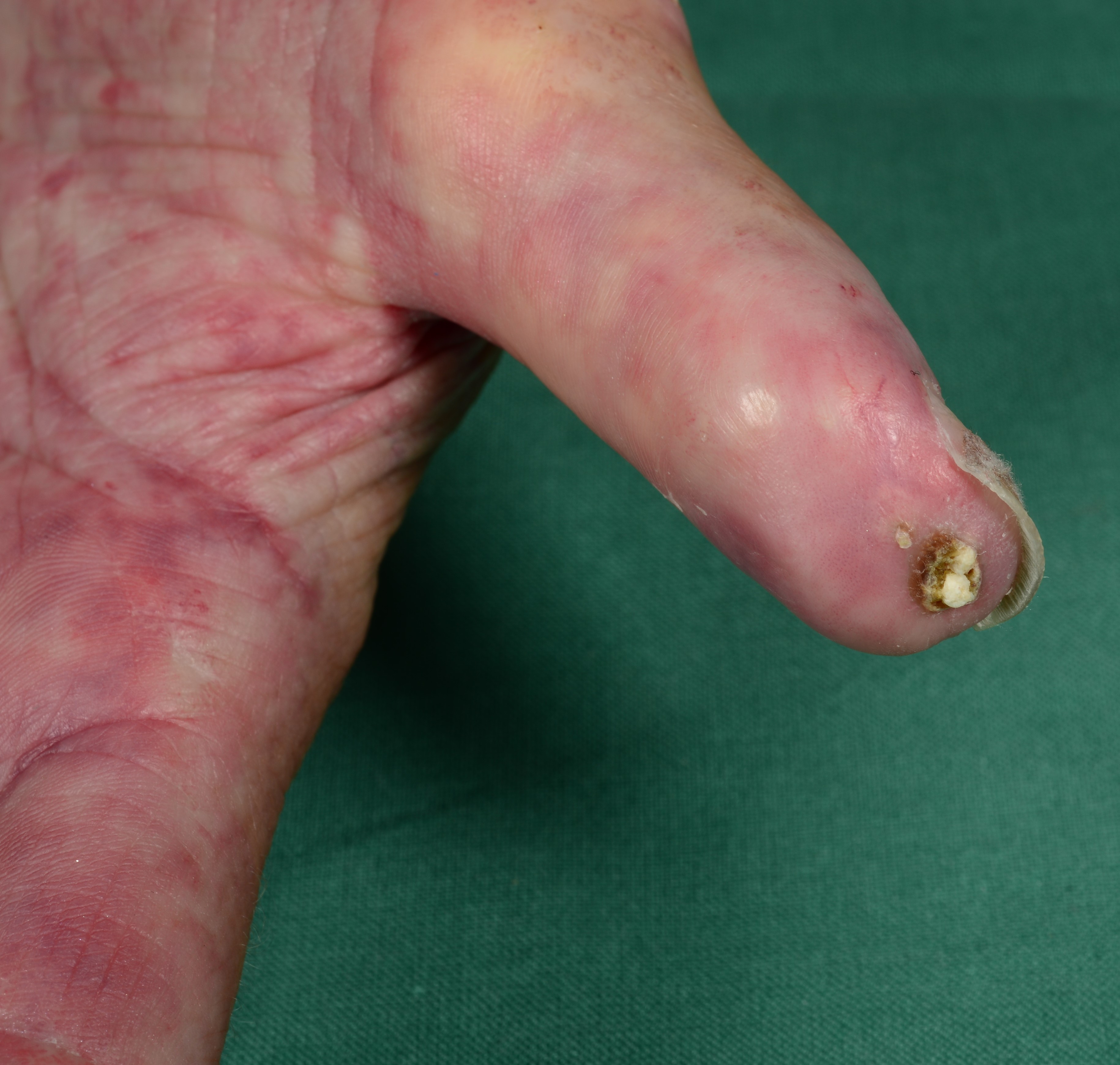Systemisk sklerodermi er bl.a. karakteriseret ved dannelse af stram, fortykket hud på fingrene. Der kan opstå sårdannelse på fingrene som her. Ofte ses pigmentforandringer og hos nogle dannes forkalkninger i huden, calcinoser, der ses på nærbilledet af tommelfingeren.