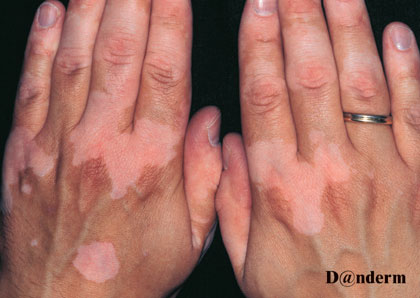 Vitiligo, en hudsygdom, der medfører hvide pletter på huden. De opsår pga pigmentmangel, og er tydeligere jo mørkere ens hud er. Ofte er forandringerne symmetriske. Her i ansigtet på en patient og på hænderne på en anden patient.