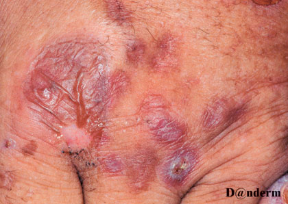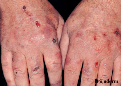 Blærer på håndrygge i forbindelse med porfyria cutanea tarda. Sidder på lyseksponerede områder og kan være smertefulde. Når blærerne brister, opstår sår og huden kan med tiden blive skrøbelig.