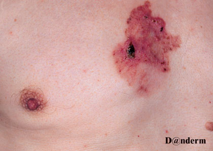 Fotos af to overfladiske (superficielle) basalcelle karcinomer, også kaldet basalcelle hudkræft. På den ene ses let pigmenteret rand omkring et velafgrænset lyserødt element, der kan forveksles med fredelig nummulat eksem eller psoriasis. Det andet karcinom, er stort, mere ensartet lysrødt og med sårskorper.