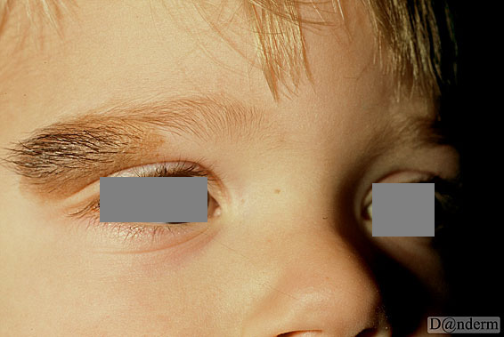 Medfødte modermærker (kongenitte nævi) er til stede ved fødslen og oftere større end dem man udvikler med alderen. Nogle gange er de lyse ved fødslen, men bliver mørkere de første par uger. I nogle modermærker kommer der kraftige hår i løbet af måneder eller år. Her to eksempler på medfødte modermærker på låret og i øjenbrynet.
