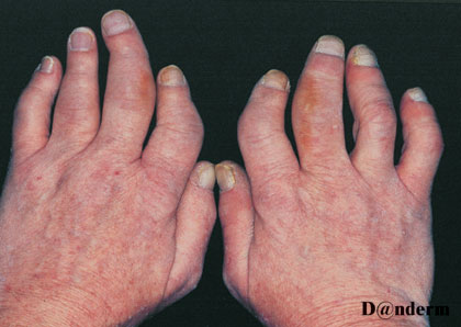 Ved psoriasisgigt ses ofte fortykkede fingre, såkaldte pølsefingre, også kaldet daktylit.