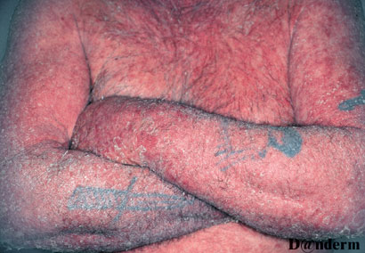 Foto af kløende, rødt, skællende eksem på overkroppen. Patient med rødme og skældannelse pga. psoriasis. Foto venligst udlånt af Danderm.