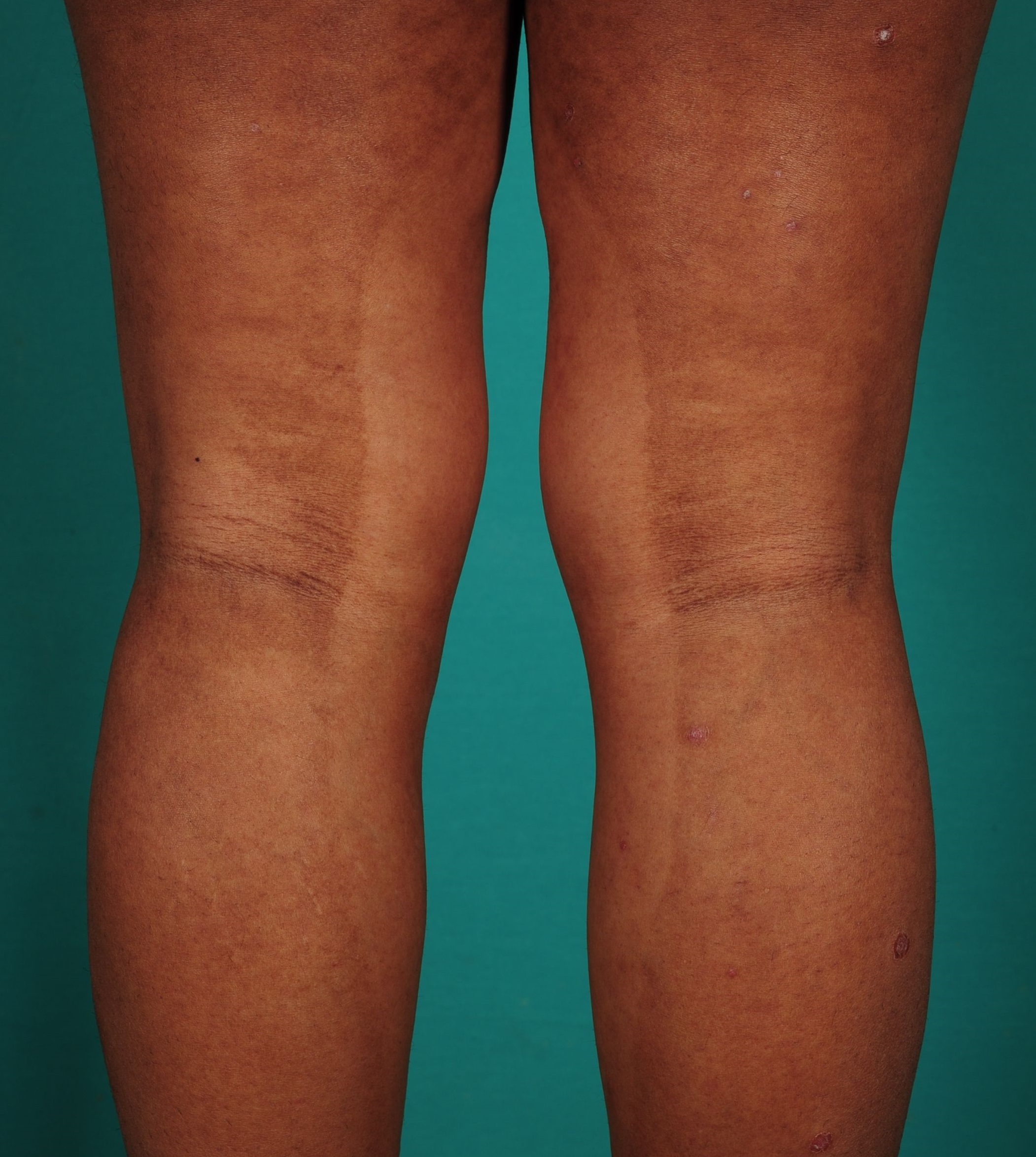 Foto af normalt forekommende hudforandring, hvor huden er mørkere på ydersiden af kroppen. Det er almindeligt at huden er flerfarvet, ofte kan man se såkaldte "demarkationslinjer" mellem yderside og inderside af arme og ben.