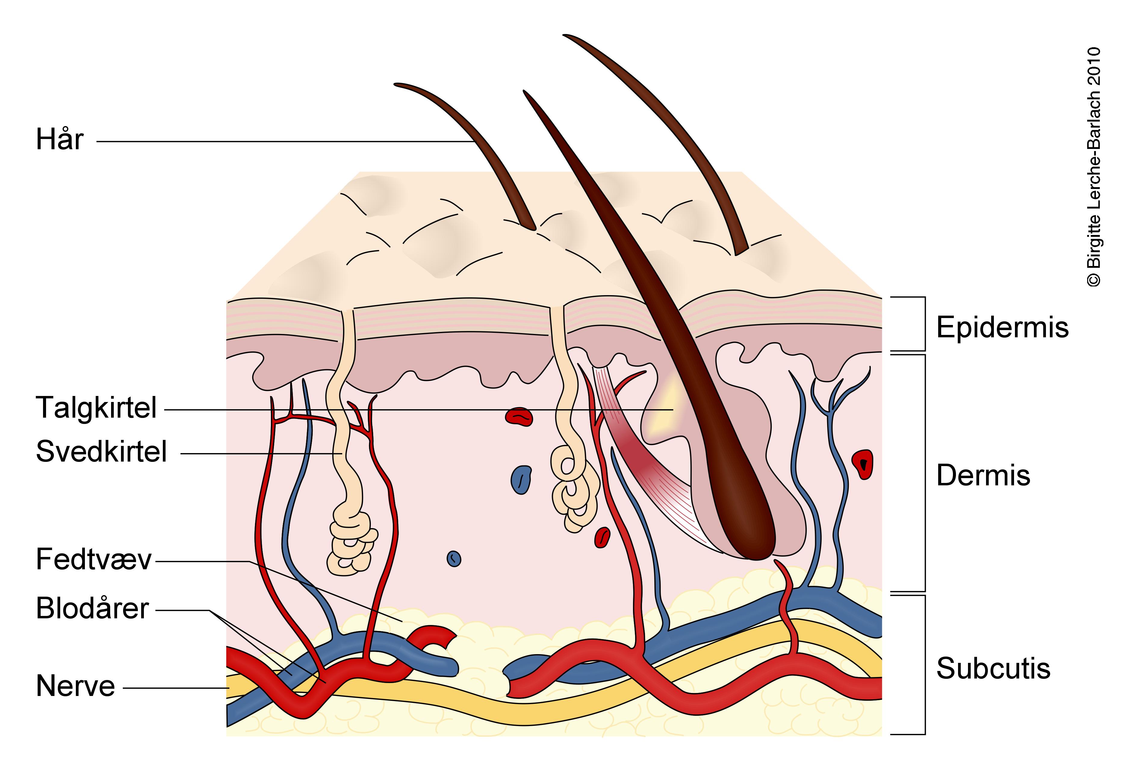 Tegningen viser hudens forskellige lag - epidermis og dermis (læderhuden), der tilsammen udgør overhuden, og underhuden der kaldes subcutis.