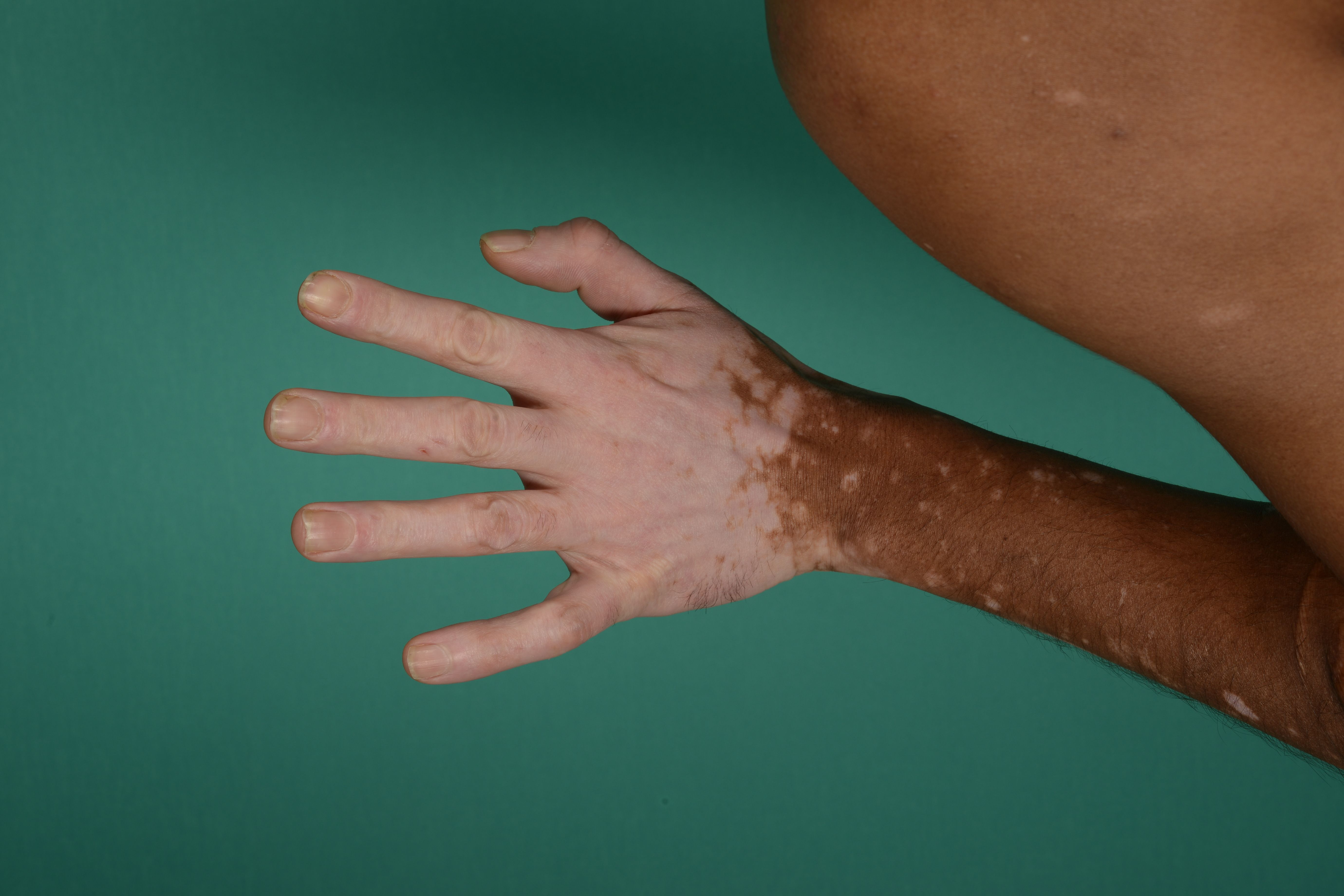 Foto af patient med vitiligo på hånd med total tab af pigment.