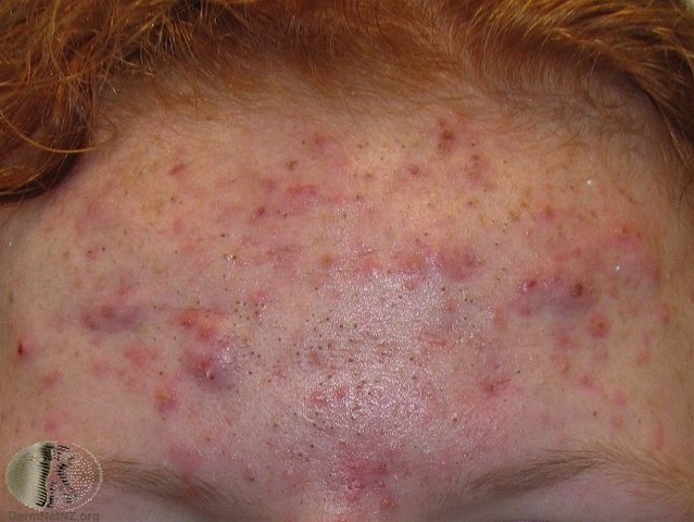 Hudorme (komedoner), som er en ophobning af talg i talgkirtlerne, hører med til sygdommen. De ses enten som små hvide hævelser (lukkede komedoner), eller som mørke små prikker (åbne komedoner). Når hudormene bliver betændte, bliver de til ømme, røde knuder. De kan udvikle sig til små bumser, der er fyldt med pus. De største kan efterlade ar.
