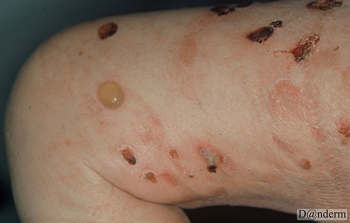 Efterhånden bliver der dannet store, spændte blærer på normal eller rød hud, ofte på bøjesiderne (albuebøjninger, knæhaserne). Men hudsygdommen kan komme overalt på kroppen. Opheling sker uden at der kommer arvæv.