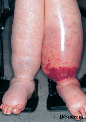 Et eksempel på en patient med meget hævede underben og et stort behov for kompressionsforbinding, ellers vil der på sigt komme svære hudforandringer og øget risiko for rosen-erysipelas. Foto venligst udlånt af DandermFoto venligst udlånt af Danderm