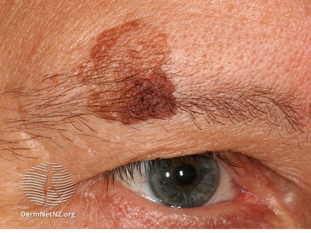 Ofte opstår alderdomsvorter, såkaldte seboroiske keratoser i pigmentpletter, som her hvor begge forandringer ses samtidigt i et øjenbryn. Foto venligst udlånt af DermNet