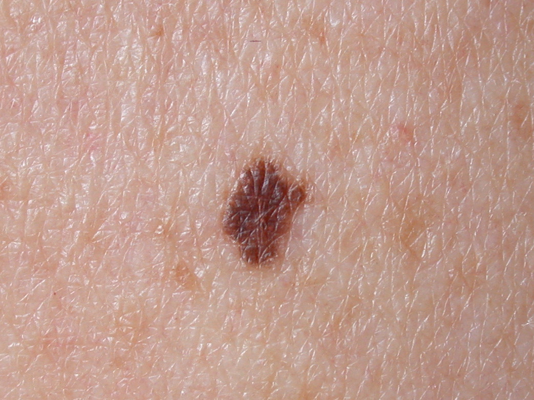 Foto af et almindeligt, godartet brunt modermærkeFoto af almindeligt brunt modermærke