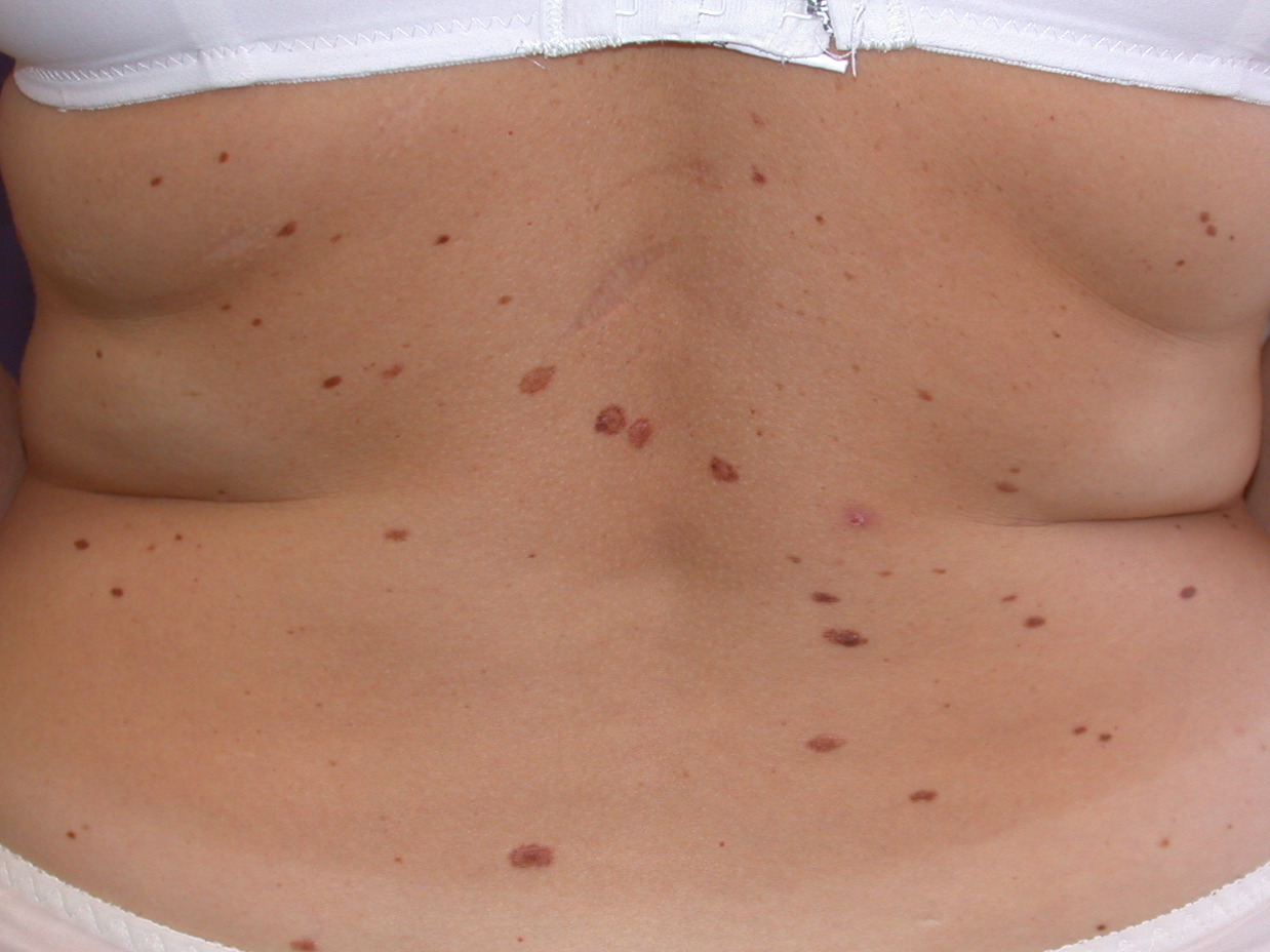 Modermærker på rygFoto af mange små ensartede brune modermærker på ryggen