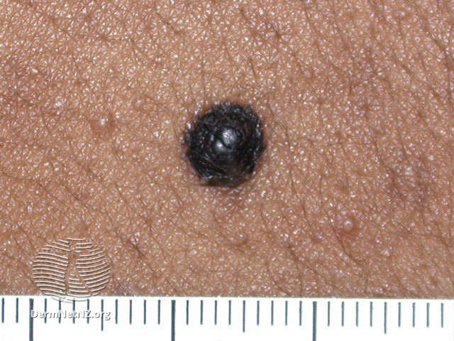 Mørkt, dermalt, medfødt nævus. Foto venligst udlånt af DermNetFoto af almindeligt, kuppelformet blåsort modermærke