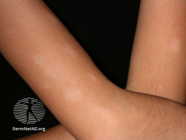 Først er pletterne rødlige, senere er de let skællende og med nedsat pigmentering (hvidlige)