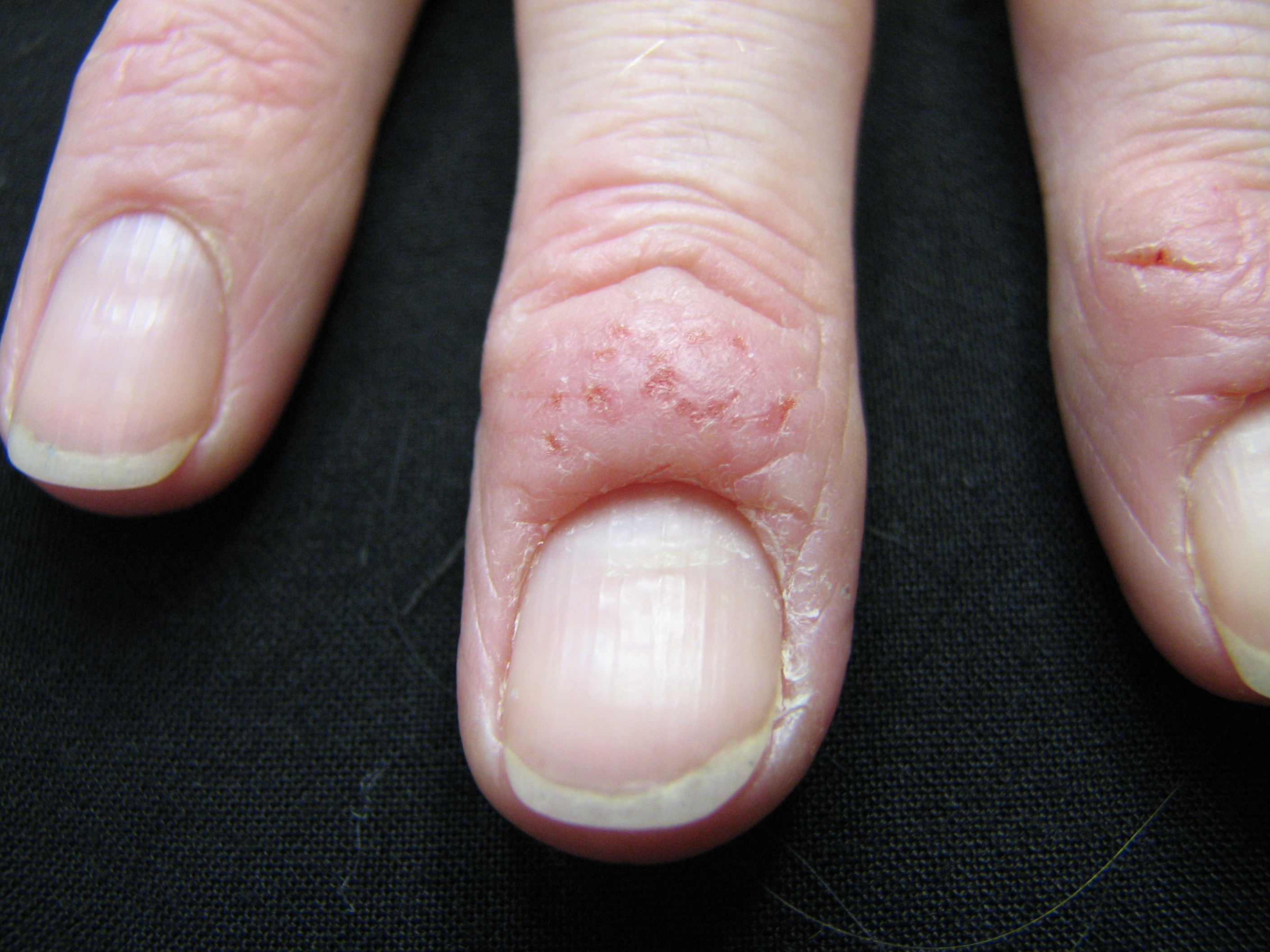Kan opstå pga. et flosset neglebånd, neglebidning, fingersutning, manicure, påsætning af kunstige negle eller langvarig kontakt med vand