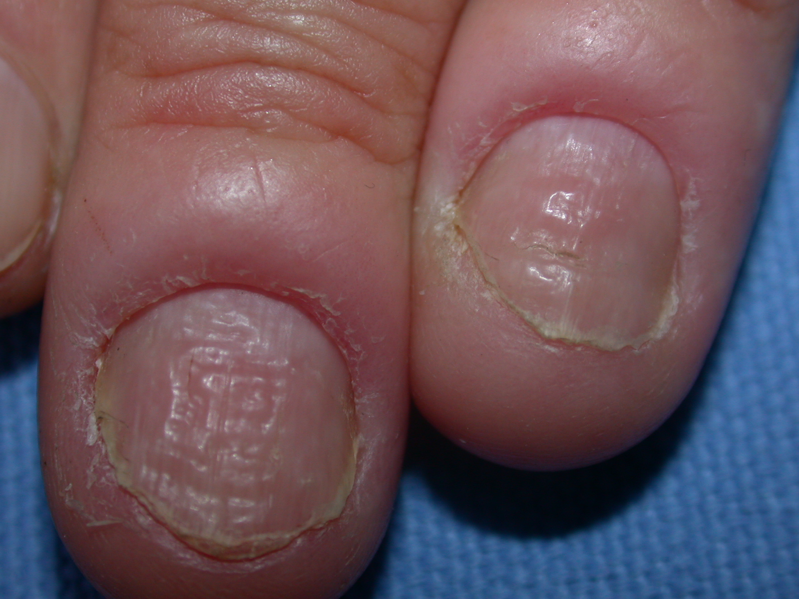 Det angrebne område er rødt, hævet og ømt. Neglebånd mangler ofte. Neglen bliver efterhånden fortykket og misfarvet og får markerede tværgående riller.