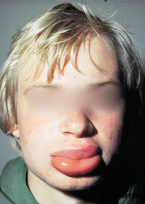 Foto af patient med såkaldt angioødem, der er nældefeber i ansigtet. Hvis det opstår samtidigt med vejrtrækningsbesvær skal man søge lægeFoto venligst udlånt af Danderm