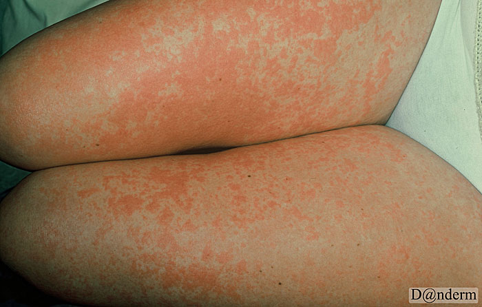 Foto af rødplettet udslæt på lårene efter behandling med antibiotikaFoto venligst udlånt af Danderm