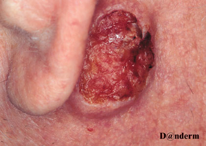 Foto af en pladecelle hudkræft bag øret, hvor der ses sårdannelse. Foto venligst udlånt af Danderm