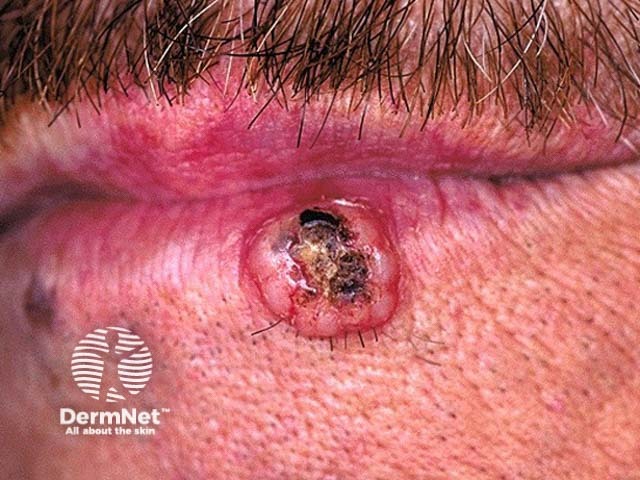 Ikke-helende sår, ofte i ansigtet, på læberne, på issen eller ørerne eller hvor kroniske sår ændrer udseende og bliver svampede eller blomkålsagtige.