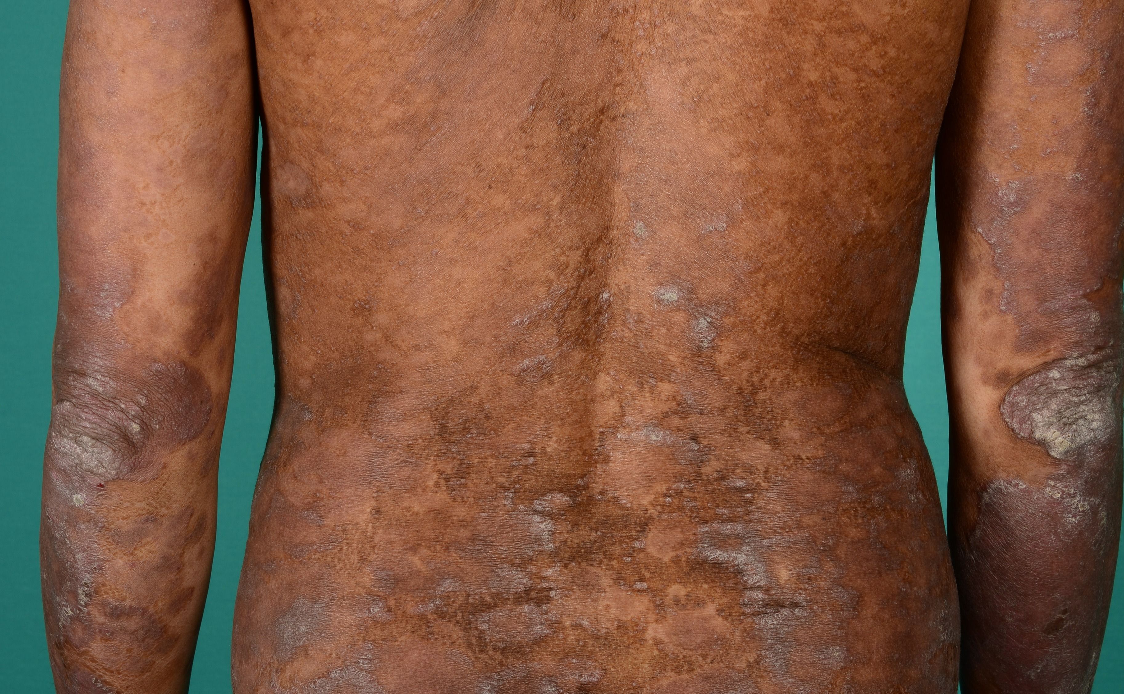 Psoriasis på lænd og albuerFoto af patient med psoriasis på lænd og albuer, her ses også spættede pigmentforandringer, der er hyppige efter eller sammen med psoriasis hvis man har mørkere hudtype.