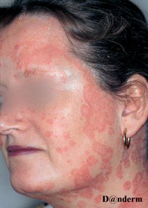 Psoriasis i ansigtet. Foto venligst udlånt af DandermFoto af patient med psoriasis i ansigtet.