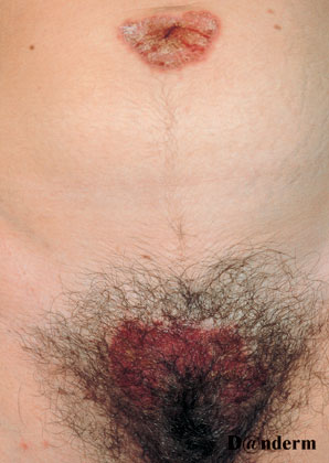 Psoriasis i navlen og i kønsbehåringen. Foto venligst udlånt af Danderm.