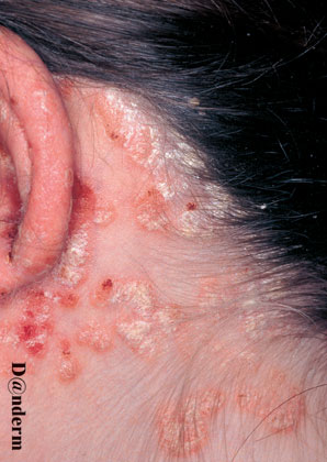 Psoriasis i ansigtet er sjælden, men det er meget hyppigt i hårbunden og inde i ørerne.