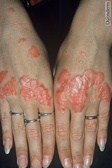 Højrøde, lyserøde, eller grålige, skællende pletter på klassiske steder på huden, fx albuer, knæ og lænden. Næsten altid skarpt afgrænset mod den normale hud.