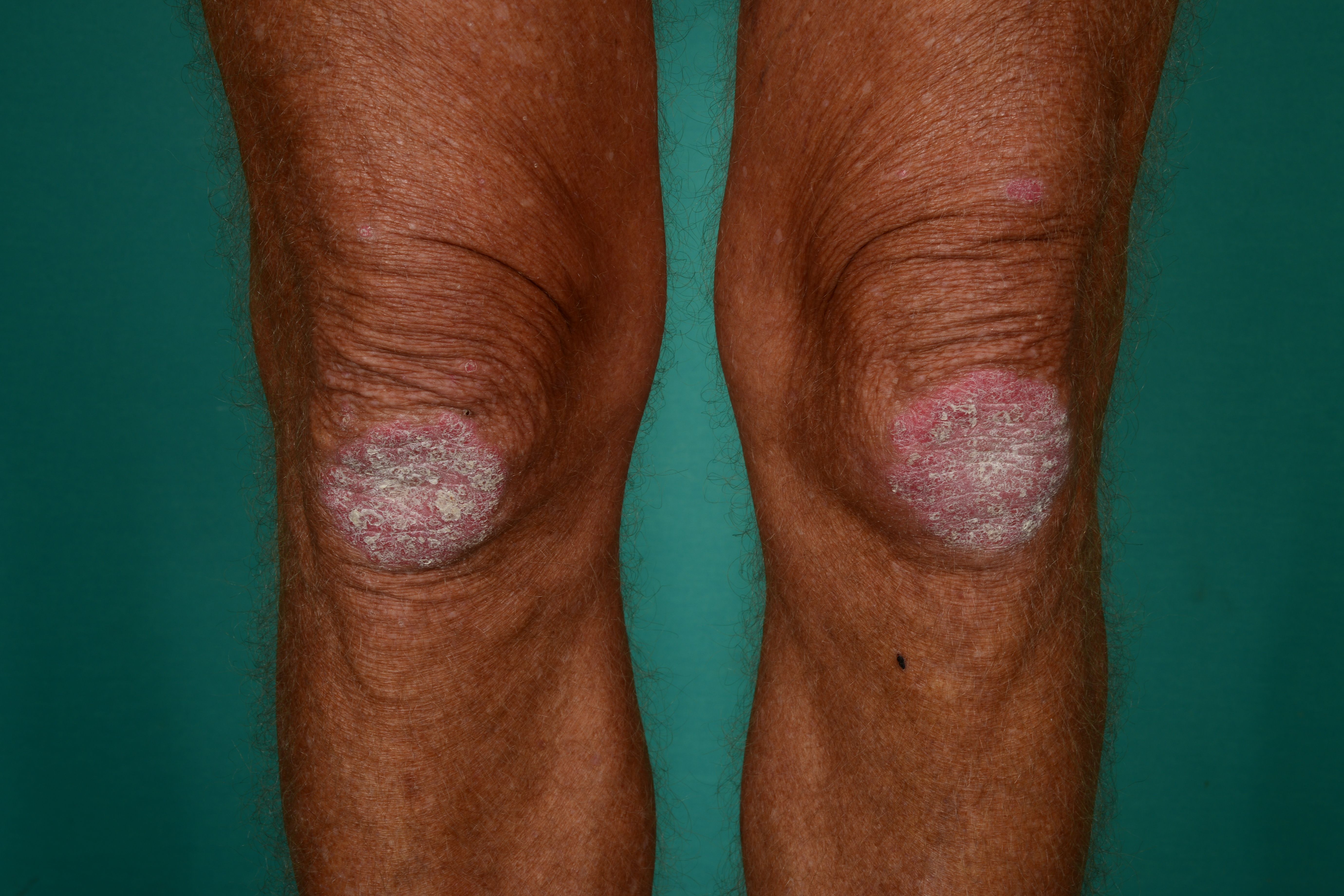 Foto af patient med psoriasis på knæ.