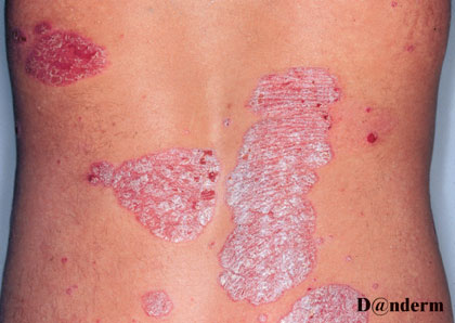 Den hyppigste form viser sig som tydelige, røde-til gråbrunlige, skællende pletter af varierende størrelse fra dråbe- til håndfladestore områder